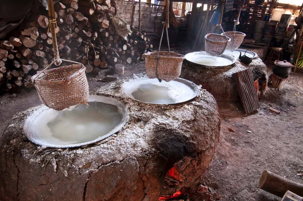 Watch villagers draw dark, mineral-laden water from deep wells using traditional bamboo pipes and wooden pulleys that creak rhythmically throughout the day. The brine gets poured into shallow evaporation pans where the mountain sun slowly transforms it into crystalline salt deposits. You’ll observe workers raking the forming crystals by hand, their movements practiced and efficient. The air carries a distinct mineral scent mixed with wood smoke from the processing fires. Large bamboo structures shelter the evaporation areas, casting geometric shadows across the white salt beds. Photography enthusiasts will find compelling subjects in the contrast between ancient wooden tools and the stark white salt formations.