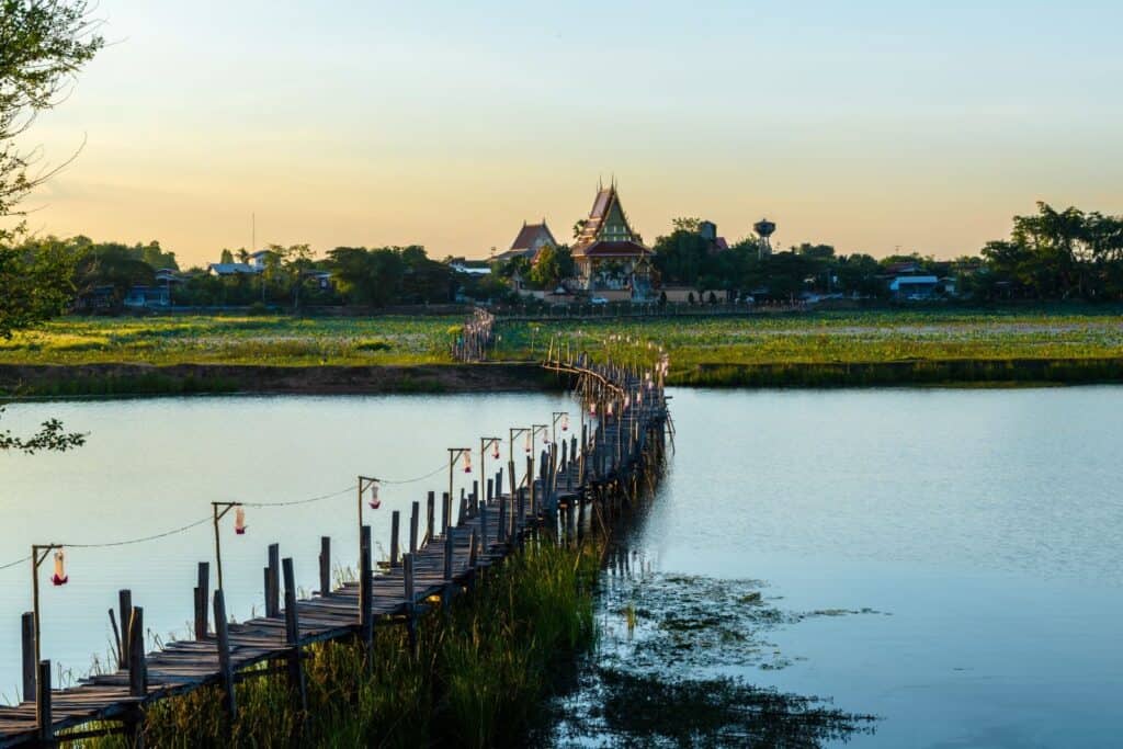 A sense of calm pervades this rural setting, far removed from Thailand’s bustling tourist centers. The gentle lapping of water against the bridge supports and the distant sounds of rural life create a meditative atmosphere. Couples often come here for romantic walks, while families enjoy picnics on the grassy areas nearby. The slow pace encourages visitors to linger, whether sitting on the bridge watching clouds reflect in the water or simply enjoying the fresh air and open skies of Isaan countryside.