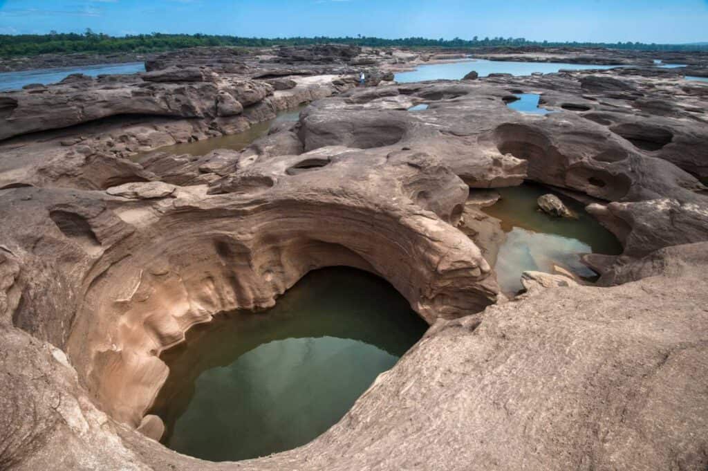 Thousands of naturally carved rock formations emerge from the Mekong River during dry season, creating what locals call the “Grand Canyon of Thailand.” Kaeng Sam Phan Bok transforms from a rushing river into an otherworldly landscape where ancient sandstone has been sculpted by water into intricate patterns, holes, and smooth surfaces. This geological wonder occurs only when water levels drop sufficiently, typically revealing formations that have been shaped over millions of years by the powerful currents of Southeast Asia’s most important waterway.