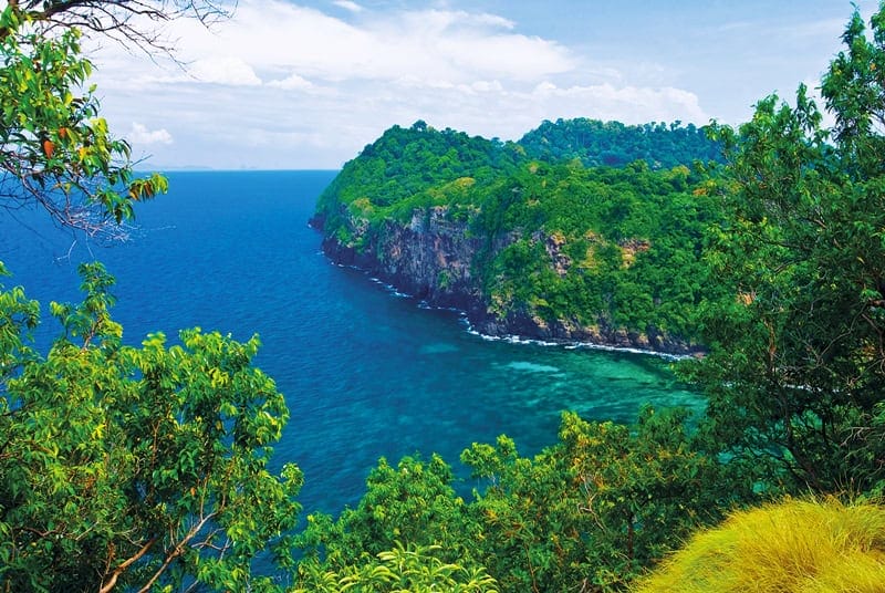 Crystal-clear turquoise waters reveal colorful coral gardens teeming with tropical fish just meters from the white sand shore. The island’s main beach stretches along the eastern coast, where gentle waves lap against powdery sand backed by lush tropical vegetation. Snorkelers can explore shallow coral formations home to parrotfish, angelfish, and butterflyfish, while the surrounding waters offer excellent visibility often exceeding 20 meters. The western side features dramatic limestone cliffs and smaller secluded coves perfect for swimming. Between snorkeling sessions, visitors can relax on the beach or explore the island’s interior trails through dense jungle vegetation.