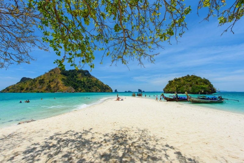 Twice daily, the Andaman Sea performs one of Thailand’s most remarkable natural spectacles as the tide retreats to reveal a narrow sandbar connecting three small islands off Krabi’s coast. Thale Waek, which translates to “separated sea,” transforms from seemingly isolated rocky outcrops into a walkable paradise where visitors can literally stroll between islands on firm white sand. This extraordinary tidal phenomenon creates a temporary land bridge that disappears as mysteriously as it appears, making timing everything for those wanting to witness this natural wonder.