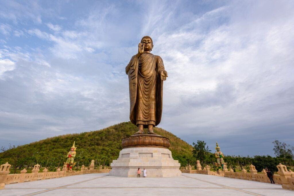 Golden Buddha statues line the hillside pathways of Wat Thip Sukhontharam, creating one of Kanchanaburi’s most photogenic temple experiences. This active Buddhist temple combines traditional Thai religious architecture with panoramic views across the surrounding countryside. The temple’s elevated position and collection of golden figures make it particularly striking during the golden hour, when the setting sun illuminates both the statues and the landscape beyond.